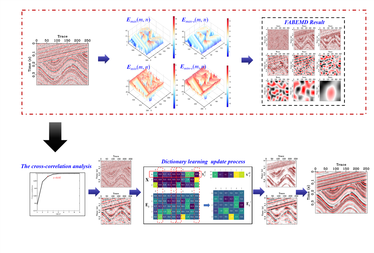 字典学习是一种比较有效地去噪的方法。然而,不断更新稀疏系数和字典需要大量奇异值分解的迭代过程,计算量巨大。对于强噪声掩盖的深层弱地震信号来说,信号的稀疏性较弱,单一字典学习压制很可能损伤信号成分。beat365唯一官方网站SWPI课题组杨继东团队创新了一种结合快速字典学习和自适应高维经验模态分解(FABEMD)的噪声压制方法(图1)。该方法利用FABEMD在高维多尺度信号分解中的优势,充分考虑地震波传播的物理规律,对地震信号进行高维自适应分解,从而提高空间相关性。为了降低计算成本,采用极值滤波代替了传统的三次样条插值法来构建包络。通过对分解后的二维本征模态函数进行互相关分析,将信号分为高频组分和中低频分量,分别应用具有针对性参数的快速字典学习算法,对低信噪比(LSNR)下的弱地震信号进行了噪声压制。此外,该方法利用顺序广义K-均值算法替代了奇异值分解的迭代过程,在提高计算效率的同时,对弱地震信号具有很强的适应性。与f-x EMD、BEMD和传统字典学习方法相比,该方法在去噪效果上更具优势(图2)。