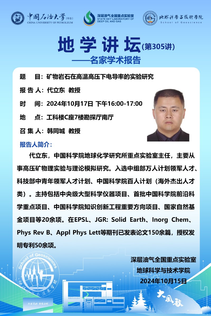 【地学讲坛第305讲】关于代立东 教授《矿物岩石在高温高压下电导率的实验研究》学术报告的通知