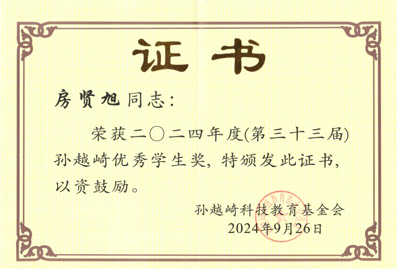 10月16日,第三十三届孙越崎能源科学技术奖颁奖大会在北京举行,我院学生房贤旭获“孙越崎优秀学生奖”。