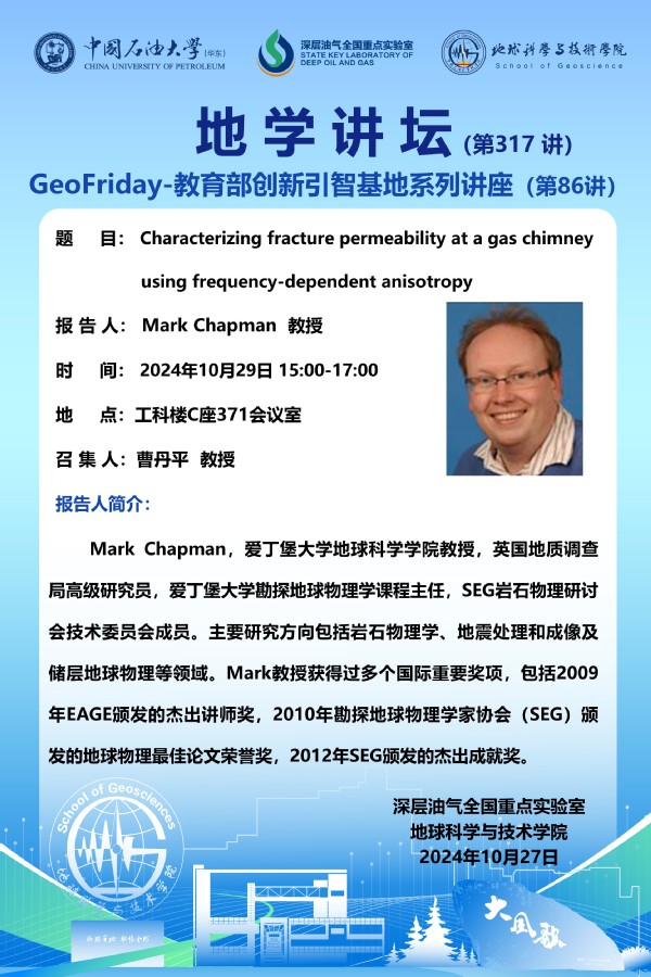 【地学讲坛第317讲】关于Mark Chapman 教授《Characterizing fracture permeability at a gas chimney using frequency-dependent anisotropy》学术报告的通知