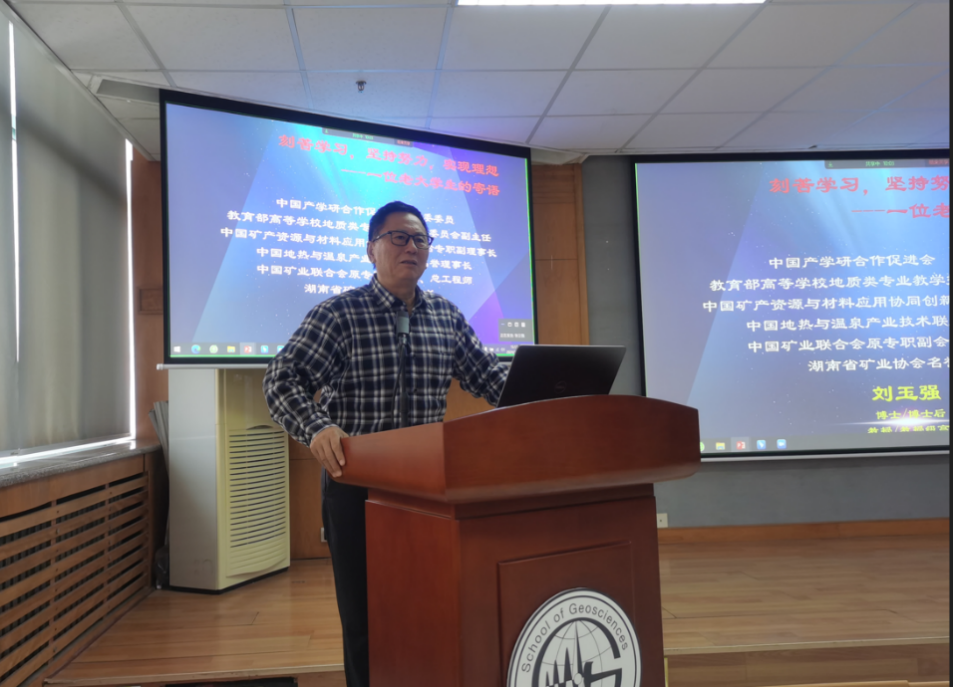 10月25日,教育部高等学校地质类专业教学指导委员会副主任、原中国矿业联合会专职副秘书长、副会长、总工程师刘玉强教授级高工受邀作题为“不忘初心,努力学习,实现理想---一位老大学生的寄语”的大思政专题讲座。学院资源勘查工程专业、本研一体班等2024级本科生130余人在线下聆听讲座,虚拟教研室教师成员以及来自中国地质大学(武汉)、山东科技大学、西北大学等全国近十余所高校30余人参加了线上会议,全国高校“双带头人”教师党支部书记工作室、教育部虚拟教研室建设点、山东省示范性基层教学组织负责人张立强教授主持会议。