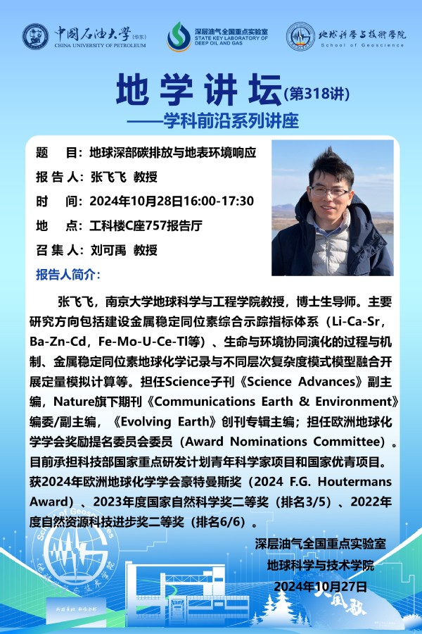 【地学讲坛第318讲】关于张飞飞 教授《地球深部碳排放与地表环境响应》学术报告的通知