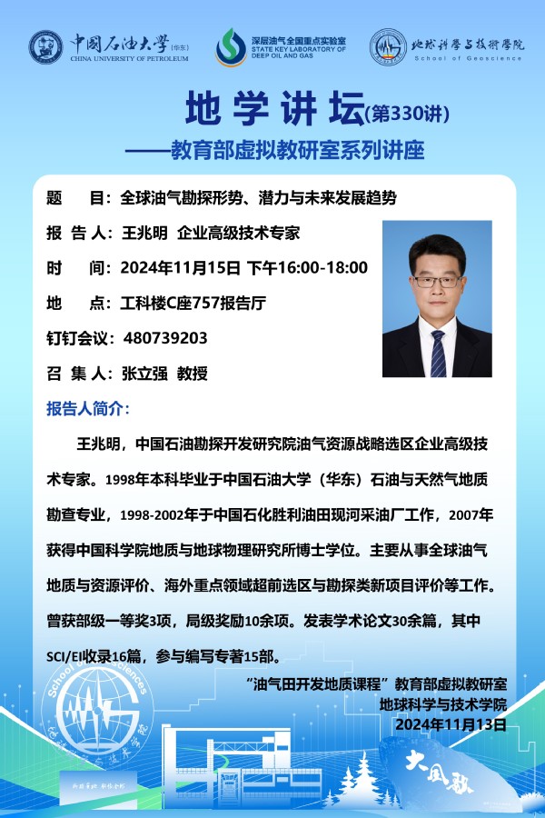 【地学讲坛第330讲】教育部虚拟教研室活动-关于王兆明 企业高级技术专家《全球油气勘探形势、潜力与未来发展趋势》讲座的通知