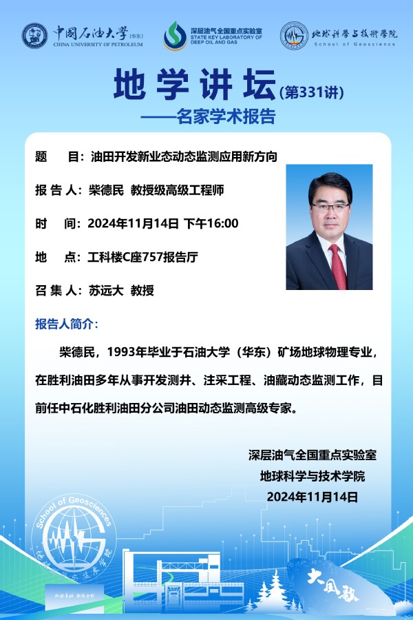【地学讲坛第331讲】关于柴德民教授级高级工程师《油田开发新业态动态监测应用新方向》学术报告的通知