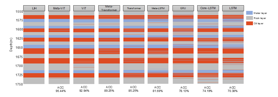 流体预测的改进对评估地质储量和制定开发策略至关重要,通过识别和分类钻井数据中的流体,可以指导合理的资源开发。本研究提出了结合元学习和视觉变换器的Meta-ViT方法,旨在解决小样本钻井数据中的流体分类问题。实验结果表明,Meta-ViT能够有效提高流体识别性能,尤其在处理复杂地质条件下表现优越。