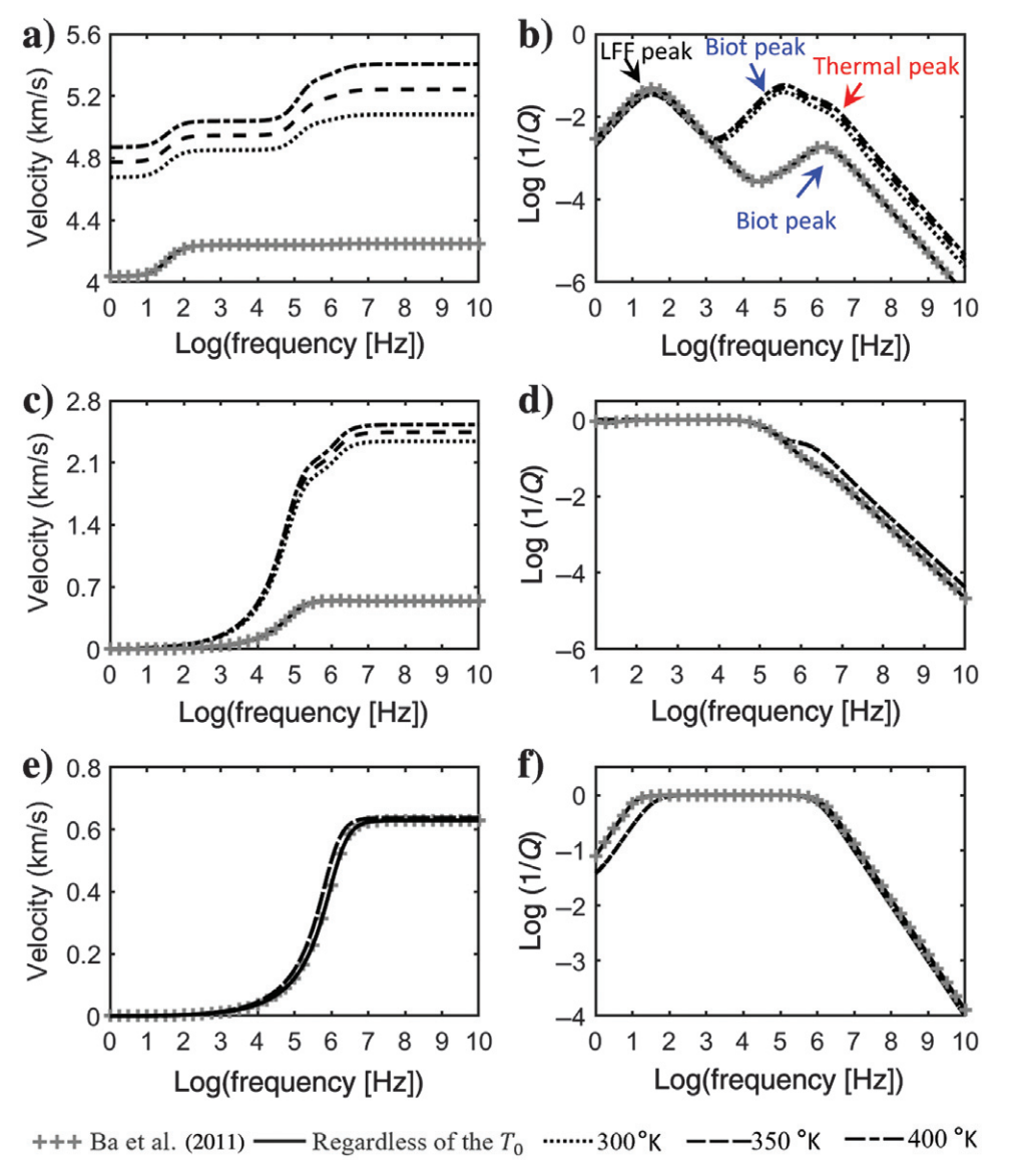 图1.不同温度下频率依赖的(a、c 和 e)相速度以及(b、d 和 f)衰减与Ba等人(2011)的双孔隙模型进行比较