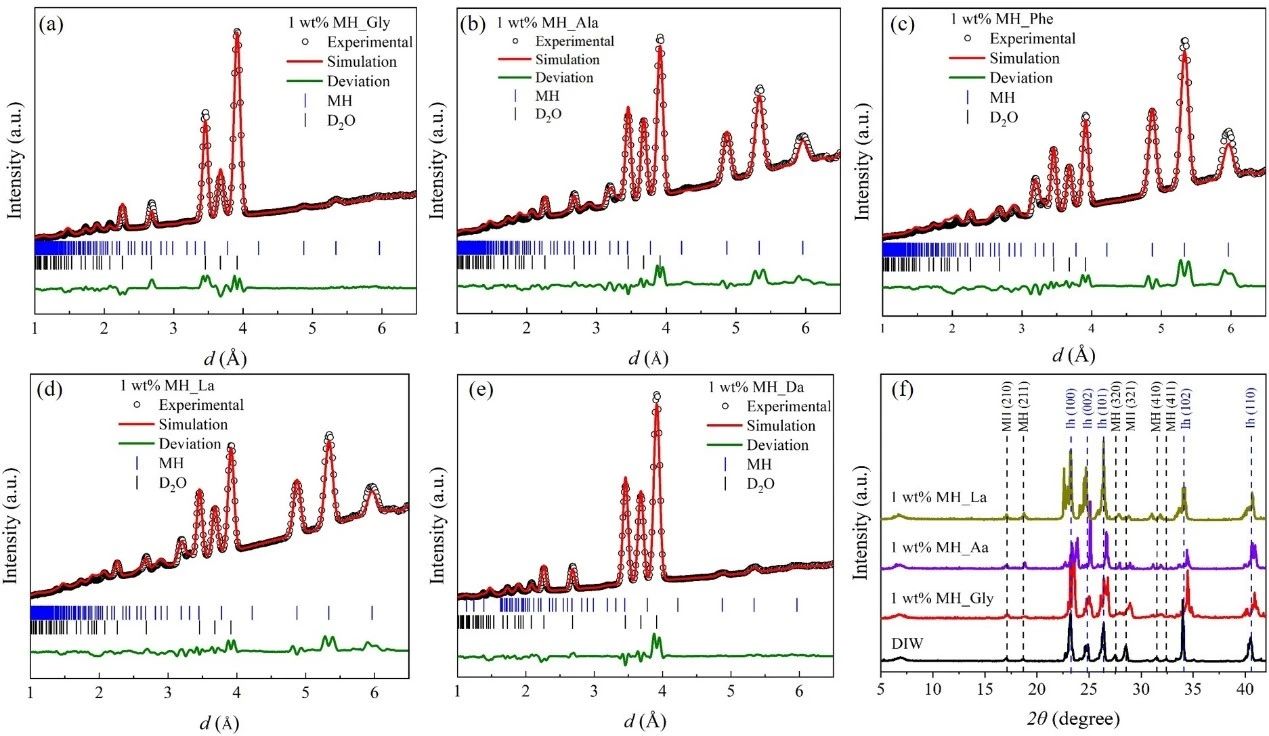 图3 MH_Gly、MH_Ala、MH_Phe、MH_La和MH_Da样品的中子衍射谱;DIW、MH_Gly、MH_Aa和MH_La样品的XRD谱