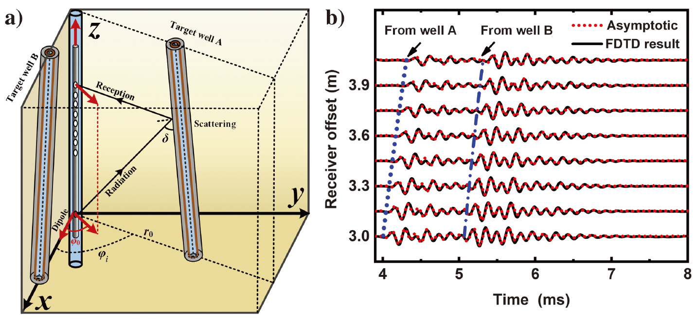 图1.(a)偶极数据多井声法测距示意图(b)使用近似解(点)和3D有限差分(实线)方法计算的多井散射波形对比