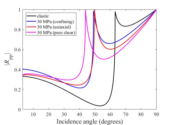 图2. 不同预应力类型下,反射P波的绝对值随下行P波入射角的变化对比