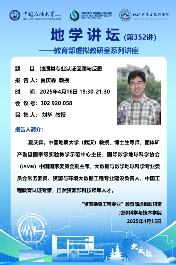 【地学讲坛第352讲】教育部虚拟教研室活动-关于夏庆霖教授 《地质类专业认证回顾与反思》讲座的通知