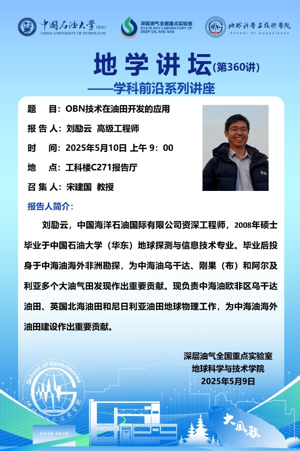 【地学讲坛第360讲】关于刘励云 高级工程师《OBN技术在油田开发的应用》学术报告的通知