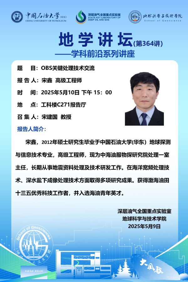 【地学讲坛第364讲】关于宋鑫 高级工程师《OBS关键处理技术交流》学术报告的通知
