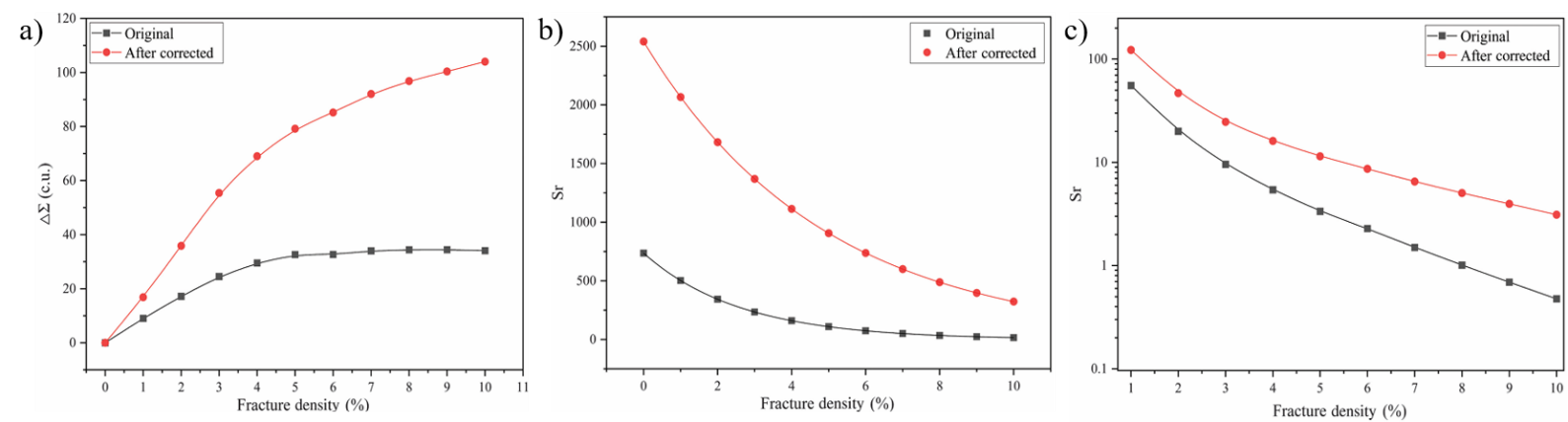 图2 自屏蔽校正前后效果对比 a)热中子俘获截面变化量与裂缝密度关系 b)热中子俘获截面变化量灵敏度与裂缝密度关系c)热中子俘获截面变化量相对灵敏度与裂缝密度关系