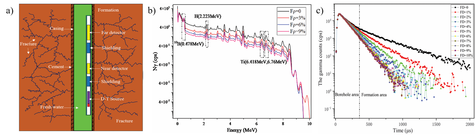 图1 脉冲中子俘获测井测量响应 a) 仪器在含裂缝地层中测量示意图 b)不同裂缝密度条件下俘获伽马能谱响应 c)不同裂缝密度条件下伽马时间谱响应