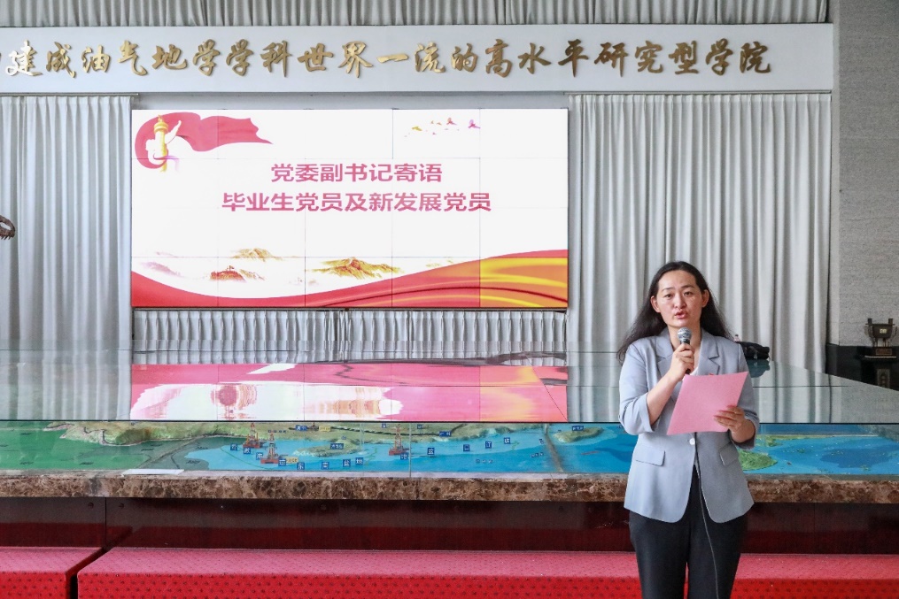 郑珊珊向即将踏上新征程的毕业生党员及新发展党员表达了祝贺与殷切期望。她指出,在这个充满希望与挑战的新时代,毕业生党员及新发展党员肩负着光荣的历史使命,作为新时代的青年党员,要深刻认识到自己在实现中华民族伟大复兴中国梦中的责任与担当,立足本职岗位,发挥先锋模范作用,坚定理想信念,勇于承担责任,在各自的岗位上为国家的发展贡献智慧和力量。希望毕业生党员要严守党员廉洁自律规范,扣好职业生涯的“第一粒扣子”,在新的征程上继续传承弘扬党的伟大精神,在祖国各地发光发热,为实现中华民族伟大复兴的中国梦贡献自己的青春力量。