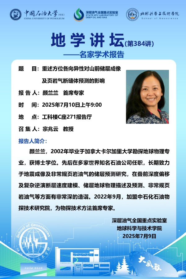 【地学讲坛第384讲】关于颜兰兰 首席专家《重述方位各向异性对山前储层成像及页岩气断缝体预测的影响》学术报告的通知