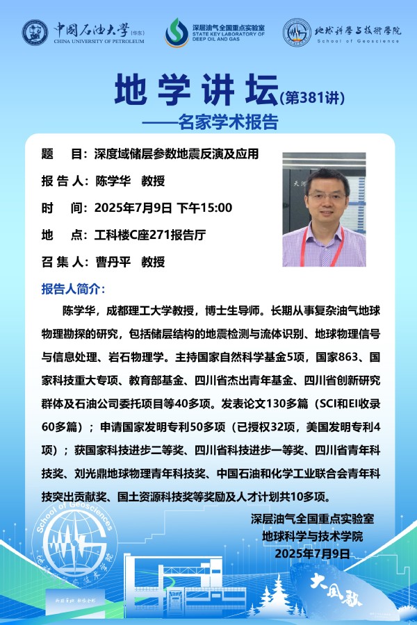 【地学讲坛第381讲】关于陈学华 教授 《深度域储层参数地震反演及应用》学术报告的通知