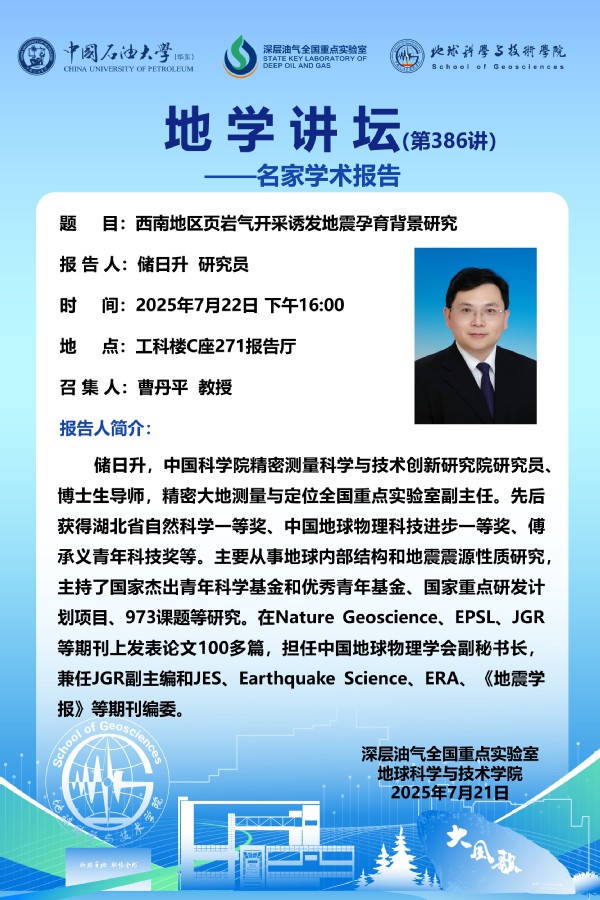 【地学讲坛第386讲】关于储日升 研究员《西南地区页岩气开采诱发地震孕育背景研究》学术报告的通知