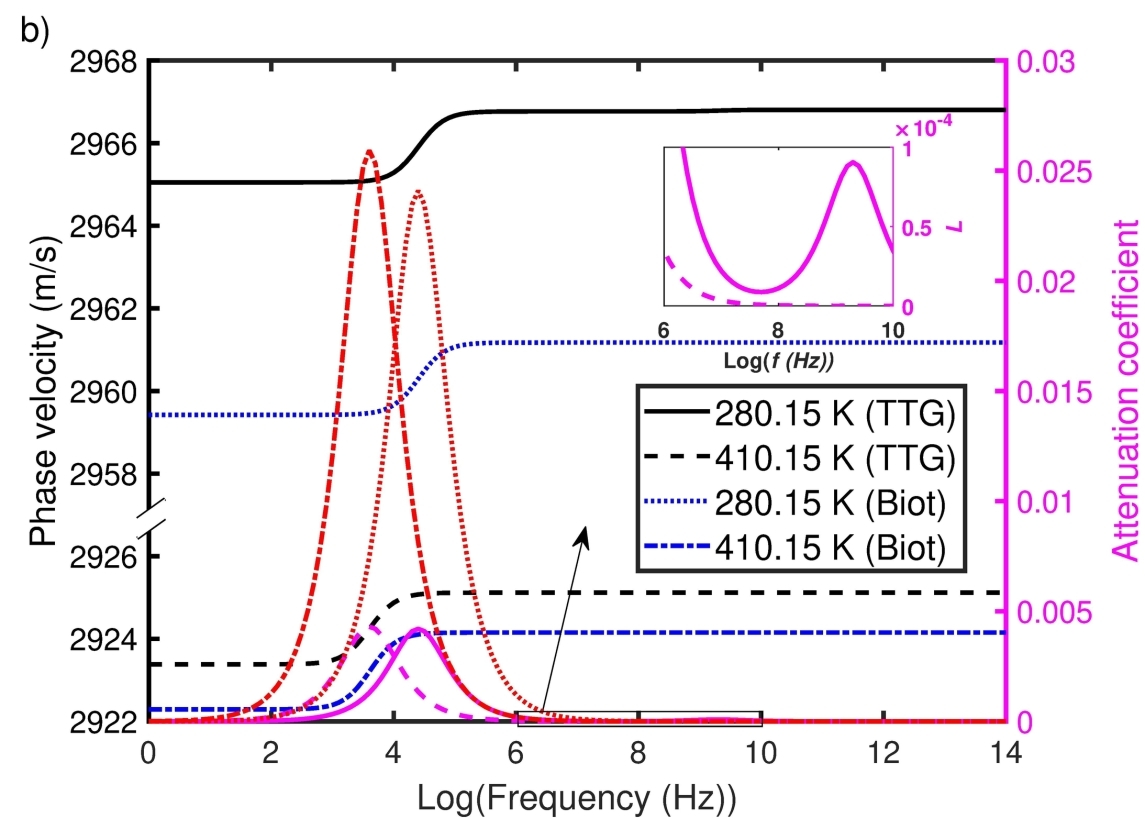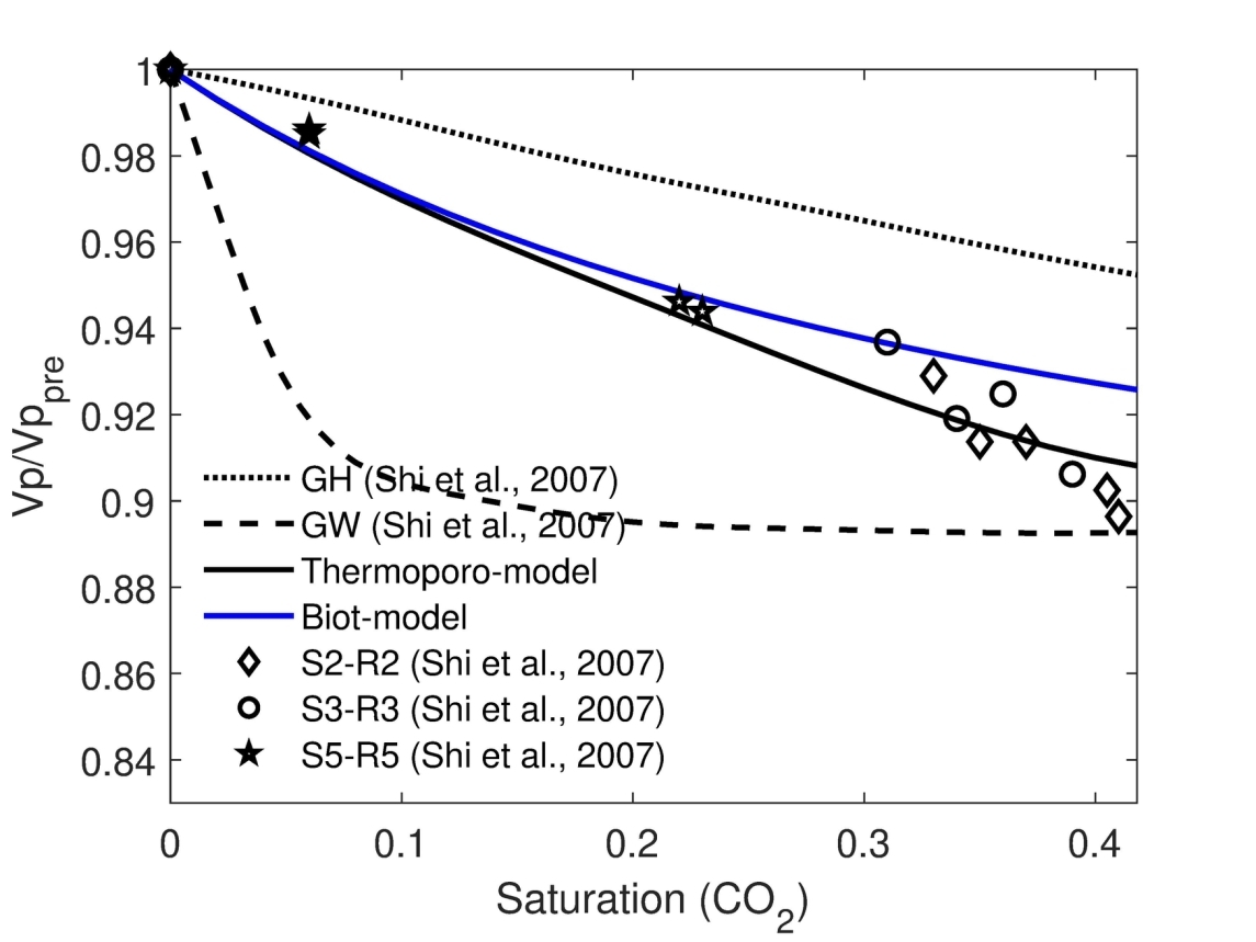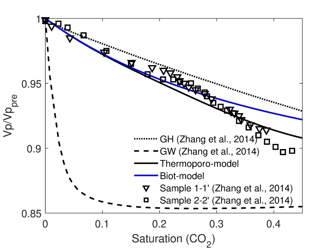 地下盐水层、枯竭的油气田和开采后废弃的煤层已被证明是大规模CO2封存的重要储层,其中高孔隙度和高渗透性的砂岩储层提供足够的储存容量。实践证明,温度决定储层流体的物理状态与热性质,在CO2运移、捕集效率和长期储存稳定性方面发挥重要作用。CO2以超临界状态(scCO2)注入砂岩储层,展现出独特的热力学特性(如粘度、密度和导热性),与温度变化密切相关。因此,系统研究温度变化对CO2性质、运移及储存状态的影响,对于优化封存策略及监测封存安全性至关重要。本文首先分析热弹参数(如密度、比热、粘度、热膨胀系数、热导率和体积模量)对温度的依赖特征。传统热孔弹理论假定固体基质和孔隙流体同温,而双温热孔弹理论 (TTG)考虑二者存在温度梯度,影响热-流-固耦合。结合实验测量与数值模拟,本文研究了温度依赖的流体性质变化、特征参数变化、饱和度变化等对地震波传播的影响,建立了适用于碳封存地震监测的热-CO2-固体-地震耦合模型,揭示了封存过程中饱水和饱CO2之间温度诱导速度频散与衰减变化的巨大差异。