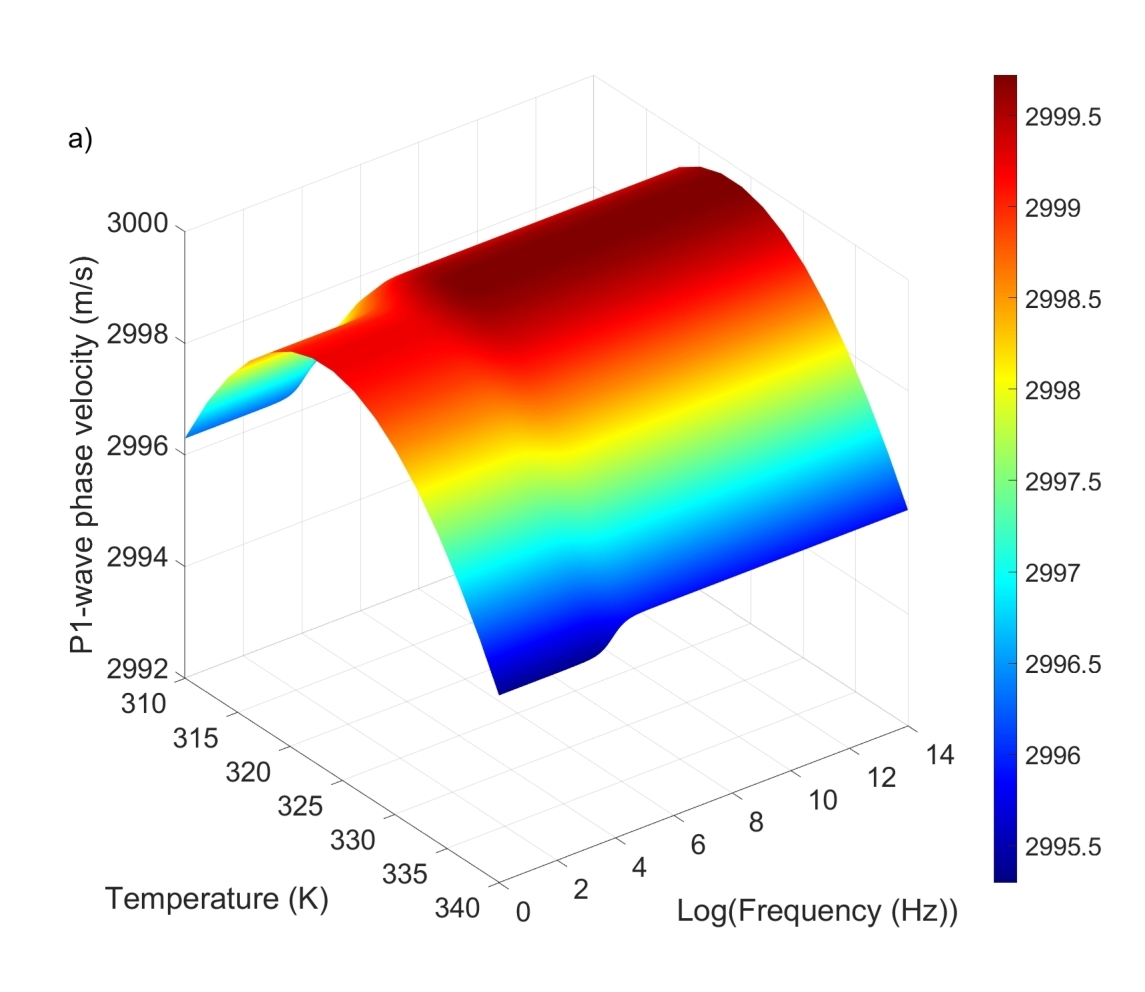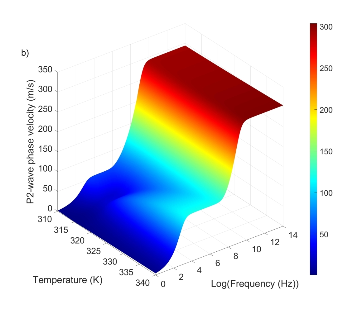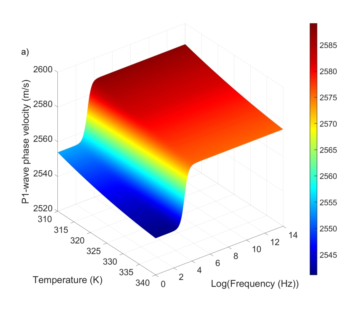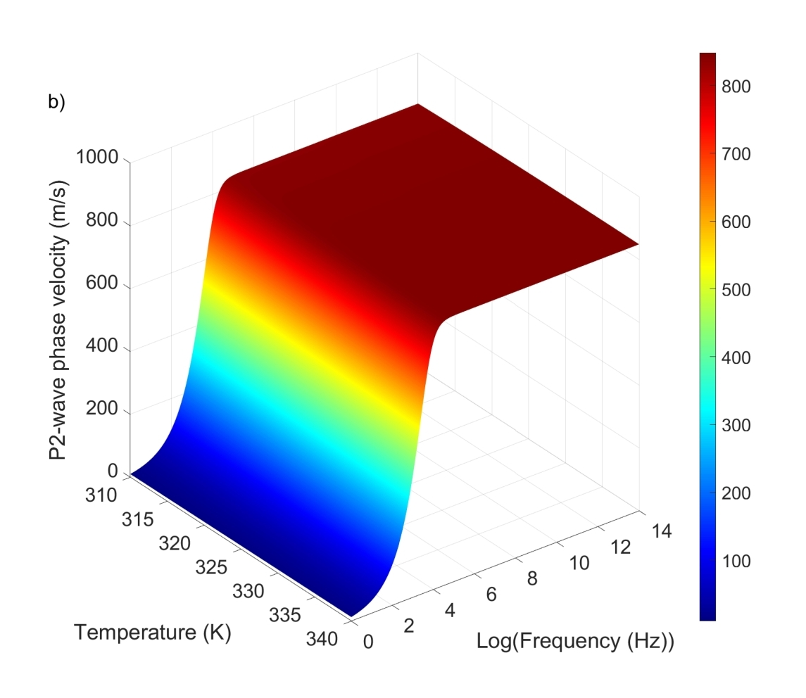 图1显示了饱和scCO2砂岩中频率、温度与相速度的关系。P1波的相速度随着温度的升高而下降,是由于scCO2的密度和体积模量随着热膨胀而降低,在1 kHz附近观察到对应于Biot衰减峰值的相速度拐点,表示在波激发过程中孔隙流体流动引起的能量损失。随着温度从310 K升高至340 K,P2波的相速度增加了约10 m/s,表明scCO2的性质对波传播的影响更为显著。