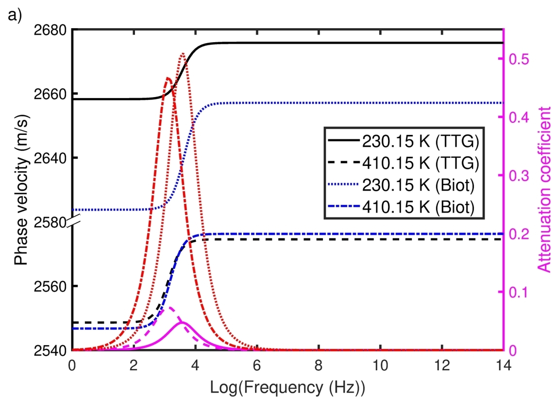图3. 不同温度下CO2(a)、含水(b)饱和砂岩中快P波的相速度(蓝色和黑色曲线)和衰减系数(红色和洋红色曲线)与频率的关系