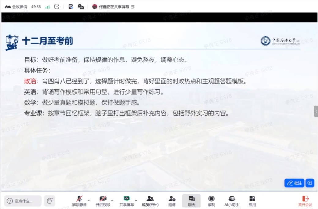 “考研不仅是知识的较量,更是心态和策略的持久战,暑假的积累将决定秋季冲刺的底气。”8月22日晚,学院2022级举行“研途加油站”线上交流,辅导员王力禾为考研同学系统分析了当前的考研形势与政策变化,并鼓励大家科学规划、保持节奏。活动邀请各专业考研朋辈咨询员围绕暑期复习常见的学习瓶颈与心理焦虑等问题,结合自身经验为同学们答疑解惑、传递信心。交流内容干货满满,从公共课复习诀窍、计划灵活调整,到解压小技巧和下半年关键时间点提醒——通过系统讲解和实时互动,帮助备考同学合理规划下一程复习方向。