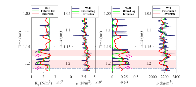 图3展示了包含非平稳卷积模型的弹性阻抗的第一阶段新型L0范数约束反演结果。图4展示了常规反演方法的四个弹性阻抗结果。图5展示了基于图 5中所示的弹性阻抗(作为观测数据)所进行的第二阶段新型非线性反演的结果,这些结果分别对应于、、和这四个岩石物理参数的估计值。图6展示了反演结果(红色曲线)与实际测井记录(深蓝色曲线)以及在剖面井 A 的位置处的滤波测井结果(绿色曲线)之间的对比情况。