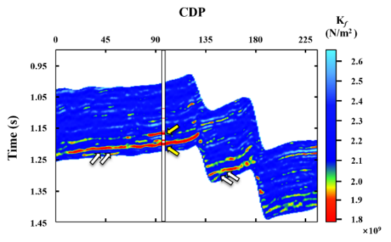 识别地层流体对于提高储层预测准确性具有重要意义。然而,当前方法的准确性和分辨率往往因依赖于线性 AVO 近似反演而受到影响。这些反演所产生的流体指标容易受到诸如孔隙度和岩石模量等多种因素的影响。为了克服这些挑战,我们认识到孔隙流体的体积模量包含了孔隙流体的基本特征,能够有效减少混合效应引起的干扰,并实现高度精确的流体识别。与此同时,认识到引入L0和L1范数作为稀疏正则化项对于提高反演分辨率至关重要。为此,基于精确Zoeppritz方程,我们推导了孔隙流体体积模量直接表征的新的非线性弹性阻抗方程,之后,我们开发了一种新的非线性弹性阻抗反演方法,该方法结合了 L0 和 L1 范数约束,并基于非平稳卷积模型。该方法不仅突破了线性近似的局限性,而且显著提高了识别储层流体的分辨率和描绘能力。该方法的有效性通过方程的精确分析和现场数据反演得到了证实,突显了其在地球物理勘探和储层预测中的实际应用潜力。