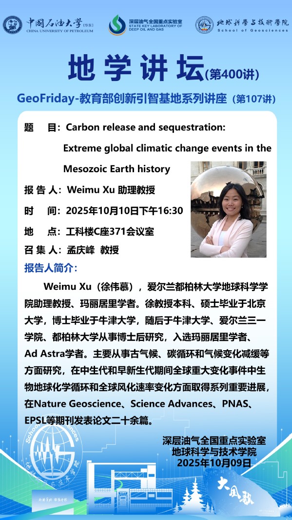 【地学讲坛第400讲】关于 Weimu Xu 助理教授 《Carbon release and sequestration:Extreme global climatic change events in the Mesozoic Earth history》学术讲座的通知