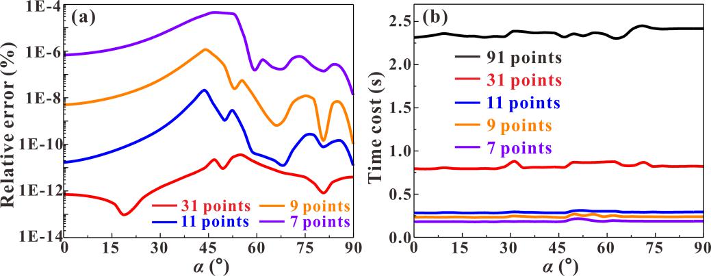 图2 不同数量积分点计算的同轴磁场分量(Hzz)效果对比:(a) 精度对比;(b) 速度对比