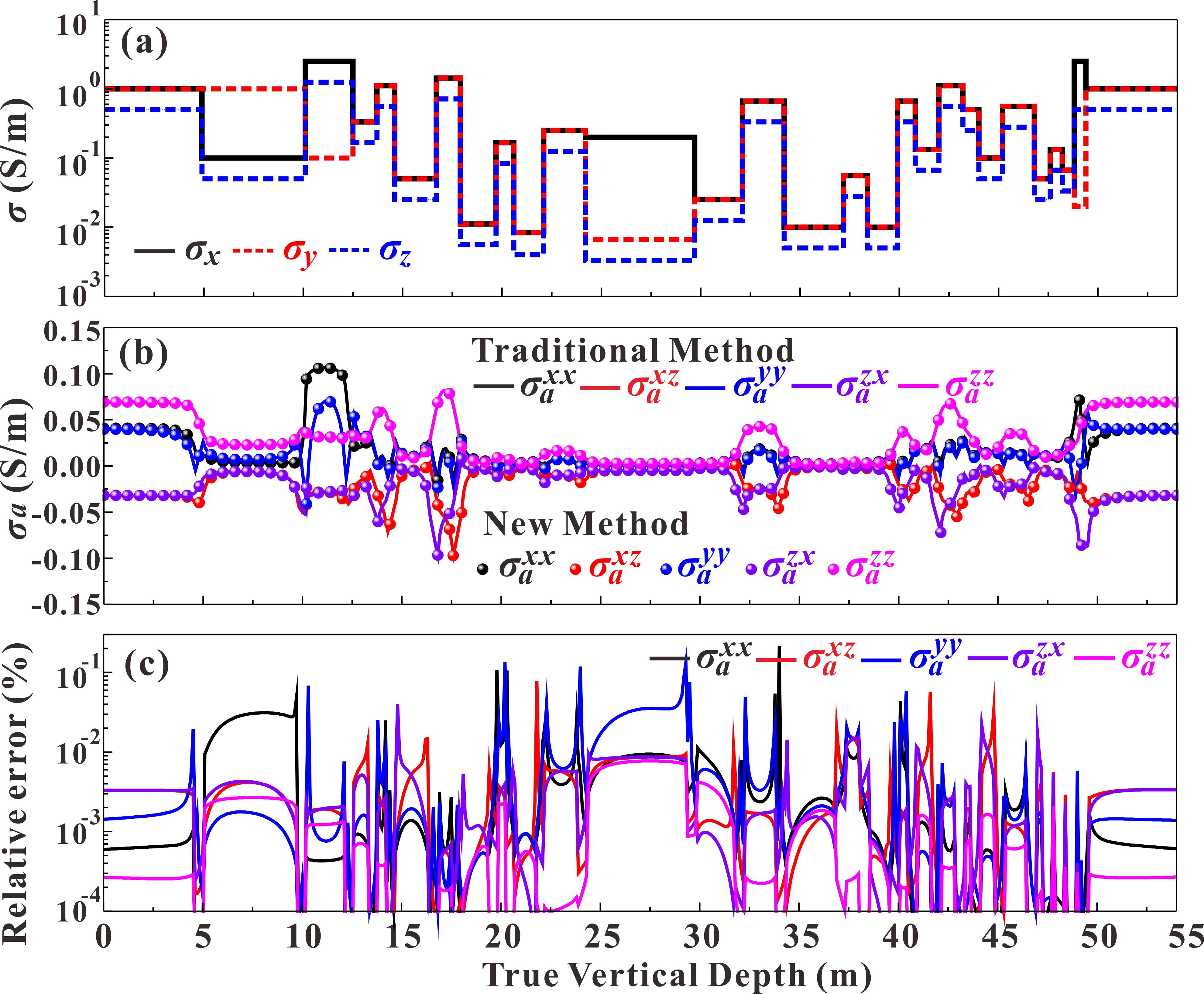 结果表明:本文提出的新方法对层状双轴各向异性地层中三轴感应测井响应计算效率提升具有显著效果。与现有方法相比,新方法通过引入虚拟边界方案改进了全局振幅传播矩阵算法,简化了谱散射场的递归推导过程;同时,创新性地采用基于极坐标的双重逆傅里叶变换技术,利用谱场在极角方向的平滑特性,结合线性插值将定积分点减少至9个,并应用外推加速求积算法高效处理半无限积分,从而将整体计算速度提升了约50倍,平均相对误差控制在0.1%以内。该方法的精度与稳定性在复杂Oklahoma模型中得到了验证,其高效性与稳定性为三轴感应测井资料的快速反演提供了关键技术支撑。