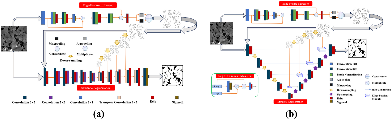 beat365唯一官方网站曹丹平教授团队硕士生王子强提出了一种双路径深度学习数字岩石图像分割模型,以边缘特征作为引导和约束,旨在获得更精确的分割结果。本研究的创新之处在于:1)提出了一个双路径深度学习分割模型,通过引入一条独立的边缘感知路径,有效弥补了传统单一路径模型在边缘细节和细小孔隙分割上的不足;2)边缘特征图在模型中扮演双重角色:不仅作为先验信息与原始图像共同输入,以引导更有效的特征提取;还作为边界约束嵌入解码模块,为图像信息恢复过程提供支持;