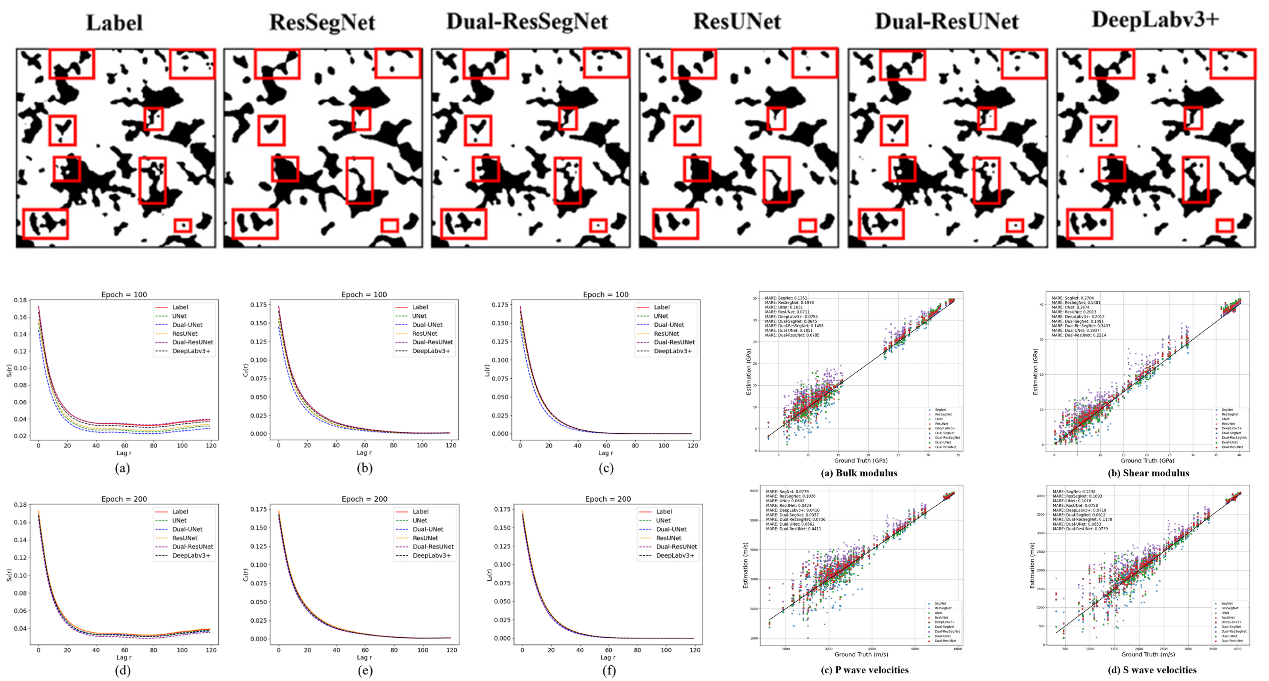 基于从开放数字岩石门户获取的砂岩与四川工区采集的碳酸盐岩样本,经非局部均值滤波去噪后构建了包含3000张训练图像与250张测试图像的数据集。在该数据集上的实验结果表明,改进后的SegNet在Dice、IoU、Precision和Recall等指标上分别提升了9.58%、16.44%、10.98%和7.57%,弹性参数(体积模量、剪切模量、P波和S波速度)的相对误差分别降低了7.06%、12.13%、4.22%和6.71%。此外,该双路径模型在小数据集上表现优异,有效降低了计算成本并减少了对大规模数据集的依赖。
