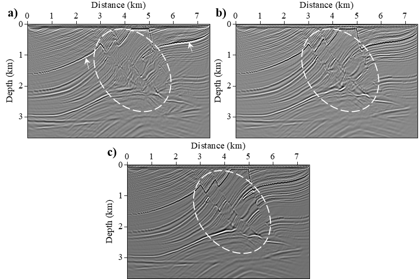 图2. 逆时偏移成像结果:(a)各向同性逆时偏移;(b)横向各向同性逆时偏移;(c)倾斜横向各向同性逆时偏移