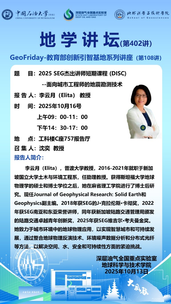 【地学讲坛第402讲】关于 李云月(Elita) 教授2025 SEG杰出讲师短期课程 (DISC)《面向城市工程师的地震勘测技术》的通知