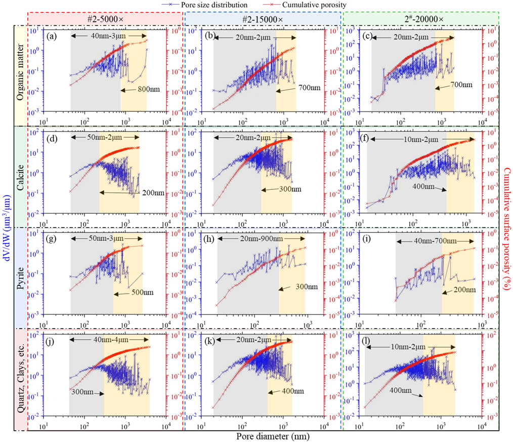 有机孔的PSD分布相对较宽(放大倍数为5000倍时为40 nm至3μm;放大倍数为20 nm至2μm),主峰约为700-800 nm(图2a-c)。尽管有机孔隙分布广泛,但其比例相对较低,仅占总孔隙的2.18%-26.7%,平均为8.29%。这表明,与其他以矿物为主的孔隙类型相比,有机质中的孔隙较少,但孔隙较大。方解石为主的孔隙也显示出较宽的分布范围(50 nm至3μm),但平均孔径较小(主峰约200-300 nm),孔隙网络比有机物更发达(图2d-f)。黄铁矿占主导地位的孔隙尺寸范围为20 nm至900 nm,通常在300-500 nm左右达到峰值,显示出适度的孔隙度贡献(图2g-i)。石英、粘土和其他硅酸盐的孔径范围最广(10 nm至4μm),分布相对均匀,但峰值在300-400 nm左右(图2j-l)。