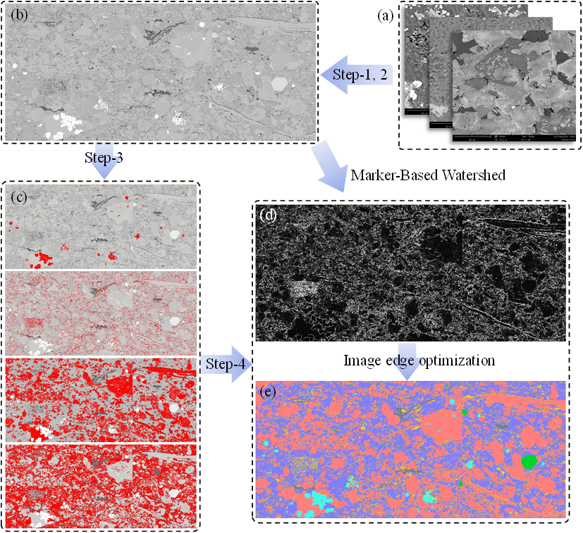 本研究旨在提出一种基于高分辨率扫描电子显微镜图像的高效、低成本和可靠的孔隙结构表征方法,以实现中低成熟页岩有机-无机孔网络的定量分析。此外,本文还系统地比较了不同放大倍数下孔隙结构参数的变化,探讨了成像分辨率对孔隙识别精度和网络结构的影响。该方法应用于东营凹陷沙河街组页岩,有效揭示了其有机-无机孔隙微观结构特征,在一定程度上阐明了中低成熟页岩孔隙发育的主要地质控制因素。研究成果有助于提高中低成熟页岩油储层质量评价的准确性,为勘探策略的优化提供技术支持和理论依据。