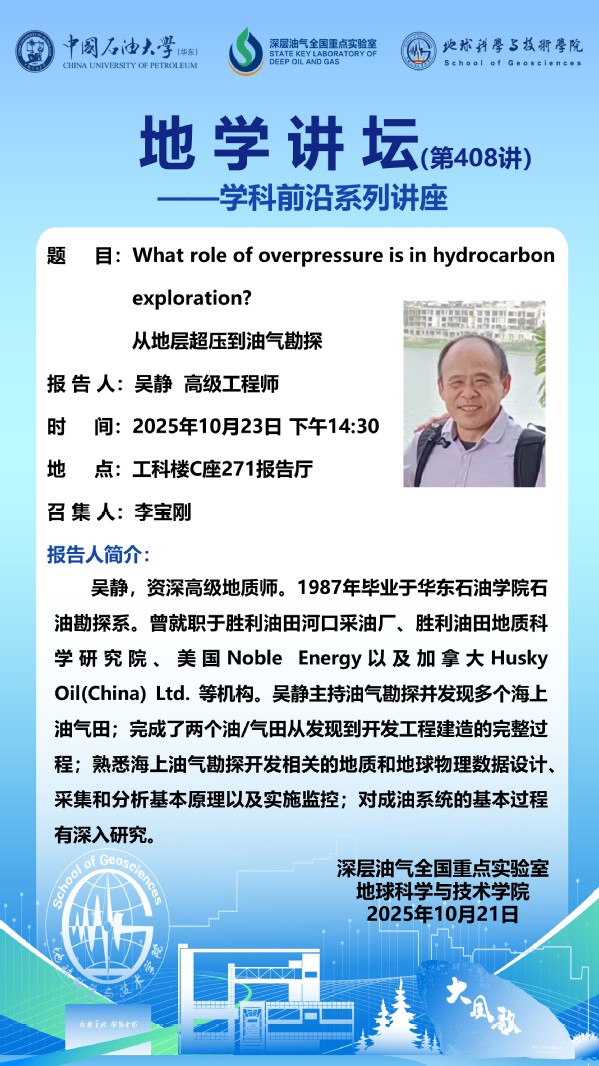 【地学讲坛第408讲】关于吴静 高级工程师《What role of overpressure is in hydrocarbon exploration? 从地层超压到油气勘探》学术报告的通知