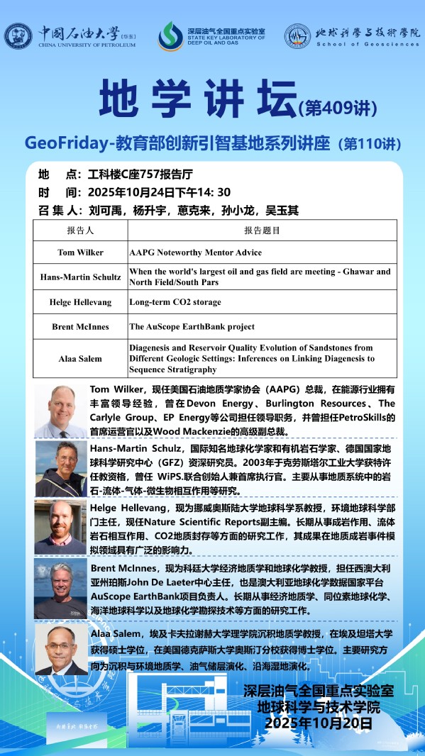 【地学讲坛第409讲】关于教育部创新引智基地“致密油气地质与勘探”系列讲座的通知