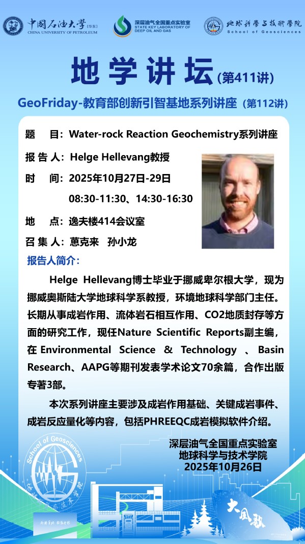 【地学讲坛第411讲】关于Helge Hellevang 教授《Water-rock Reaction Geochemistry》系列讲座学术报告的通知