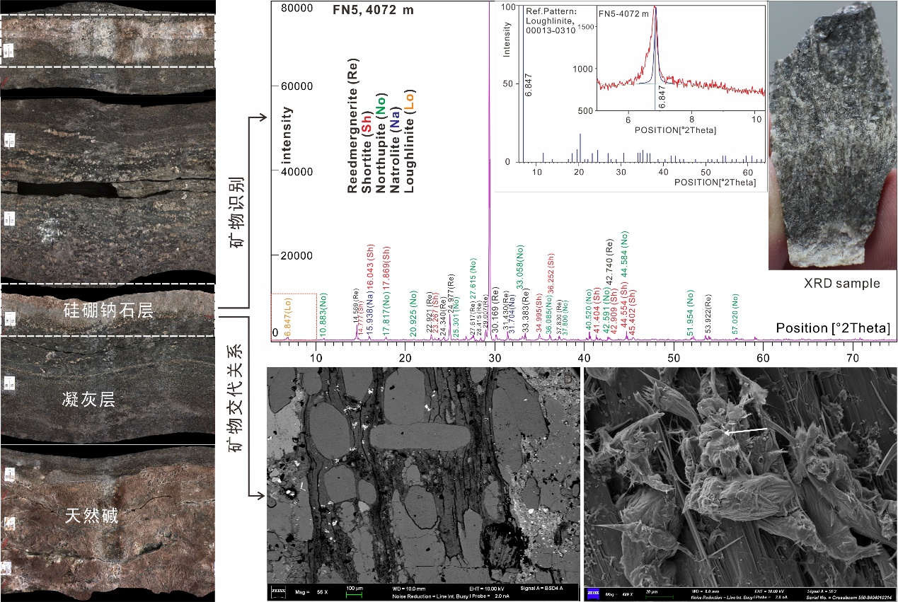 本次研究分别选取了位于蒸发盆地蒸发中心的岩心段和位于盆地边缘的岩心段开展相关研究。盆地中心蒸发序列研究表明:①硅硼钠石中的硼元素主要来源于富硼火山及火山相关的热泉;②碱盐发育层段成岩矿物的交代过程为:天然碱蒸发沉淀→丝硅镁石(热水富镁环境下的自生黏土矿物)交代天然碱→硅硼钠石在丝硅镁石晶间沉淀。蒸发韵律中的硼元素富集与火山和热水地质事件相耦合;地层序列中硅硼钠石的含量指示了沉积环境中的火山和热活动等重要地质事件。