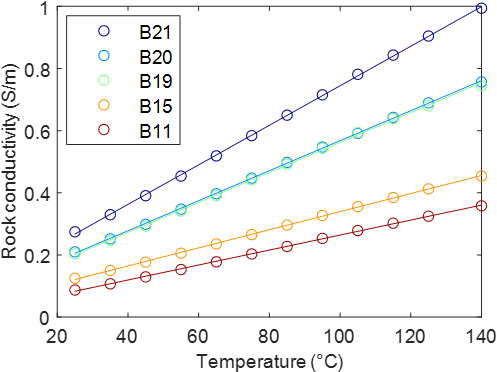 图1. 五块Berea砂岩样品随温度变化的岩石电导率变化