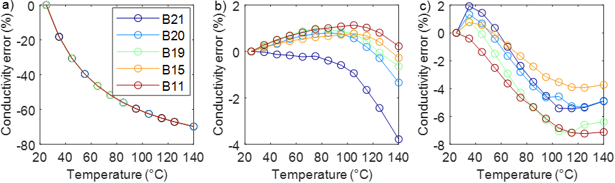 图3. 在分别假设(a)盐水电阻率、(b)岩石孔隙度和(c)胶结指数不随温度变化的情况下,Berea砂岩样品随温度变化的计算电导率与实测电导率之间的相对误差