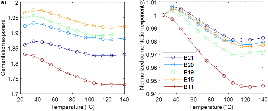 图2. 五块Berea砂岩样品的(a)胶结指数与(b)归一化胶结指数随温度变化的计算结果