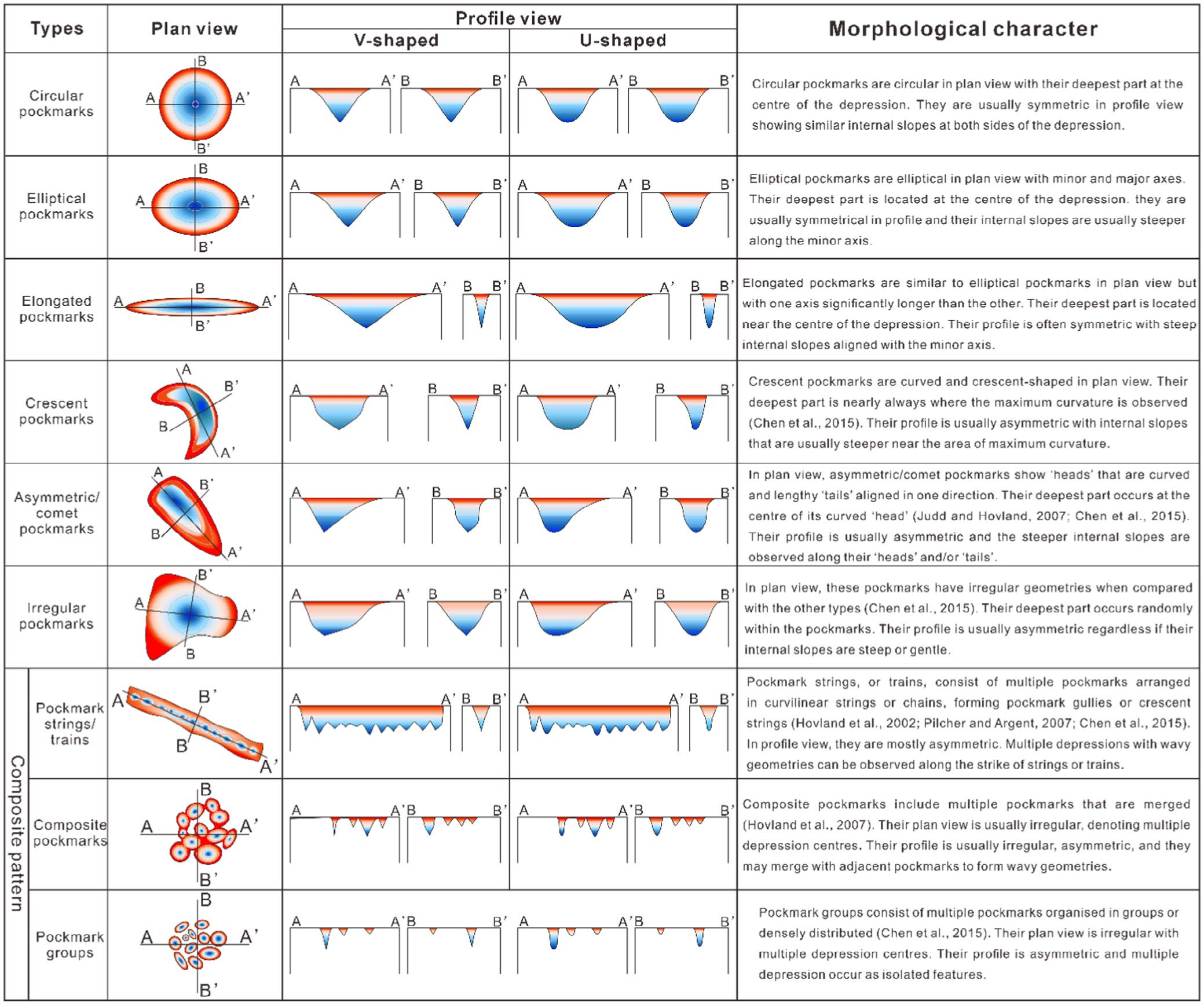 麻坑(Pockmarks)为海底凹坑,被认为是流体从海底发生逃逸的重要指示。麻坑在全球多个区域都有发现,如北海、墨西哥湾、西非、南海等,对地球生物圈、水圈和大气圈具有影响。麻坑通常在海底上表现为圆形凹坑,有时也可表现为椭圆形、新月形、不对称形或不规则形凹坑,多个麻坑能相互组合而形成不同形态的组合样式(图1)。在海底上,大型麻坑可作为相对长期的流体渗流通道,也可被后期沉积物掩埋而成为古麻坑。对于海底任意分布的麻坑,存在两种不同的机制来解释其形成过程;与之相对比,对于海底相对规则分布的麻坑,其形成往往与麻坑之下的断裂、古河道、古峡谷、底劈等有关。目前缺乏对于麻坑及其相关铲式断层的定量关系研究,限制了我们对于麻坑在海底形成过程的理解。