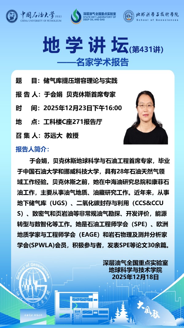 【地学讲坛第431讲】关于于会娟首席专家《储气库提压增容理论与实践》学术报告的通知