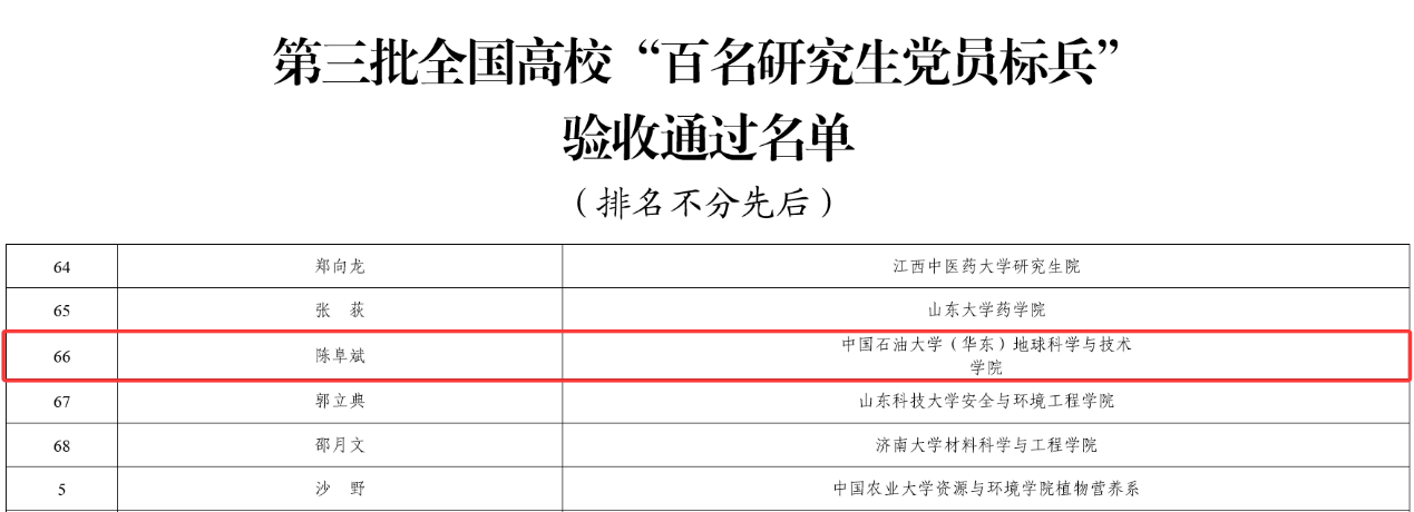 德才兼修的成长之路,让陈阜斌收获了多项重量级荣誉:先后斩获中国大学生自强之星、博士研究生国家奖学金、SEG奖学金、王涛英才奖(博士)、学校研究生“学术十杰”等荣誉称号,更成功入选首届中国科协青年人才托举工程博士生专项。陈阜斌同志作为学校研究生党员的优秀代表,以深厚的家国情怀投身强国伟业,充分彰显了石大学子“家国同心、艰苦奋斗、惟真惟实、追求卓越”的精神风貌,成为学院“立德树人”根本任务落地见效的生动范例。