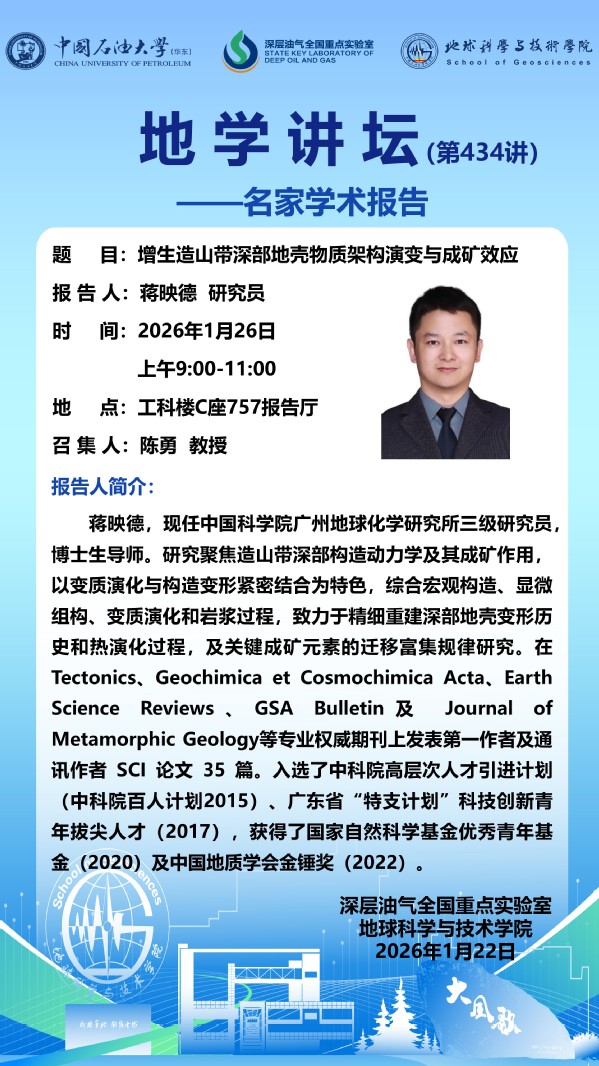【地学讲坛第434讲】关于蒋映德研究员《增生造山带深部地壳物质架构演变与成矿效应》学术报告的通知