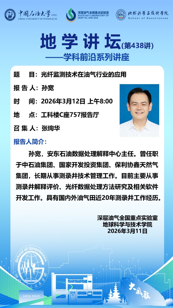 【地学讲坛第438讲】关于孙宽 《光纤监测技术在油气行业的应用》讲座的通知